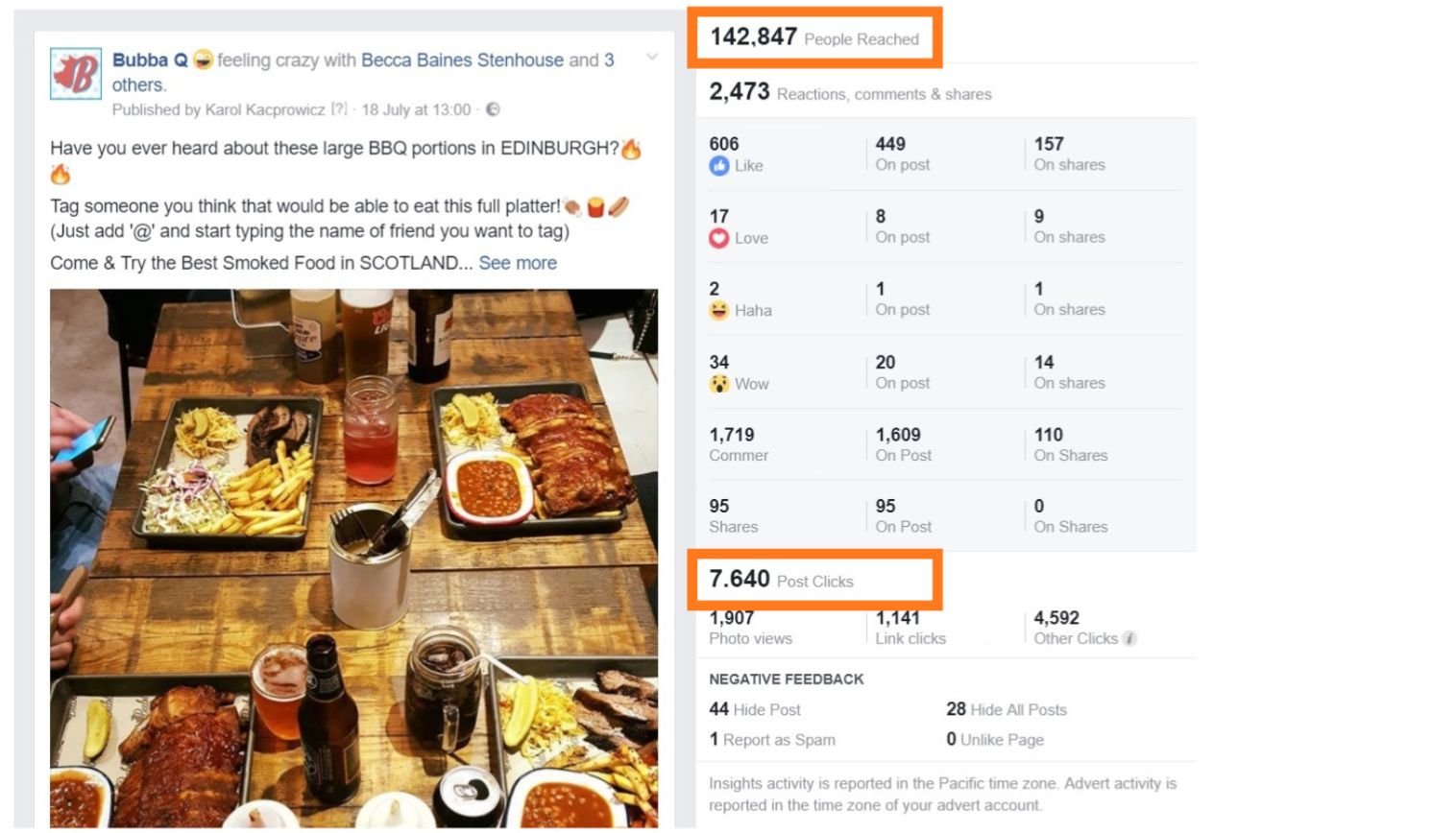 An example campaign for BubbaQ demonstrates the power of focused social media advertising. Our targeted campaign reached 142,847 Facebook users across Edinburgh and surrounding areas.